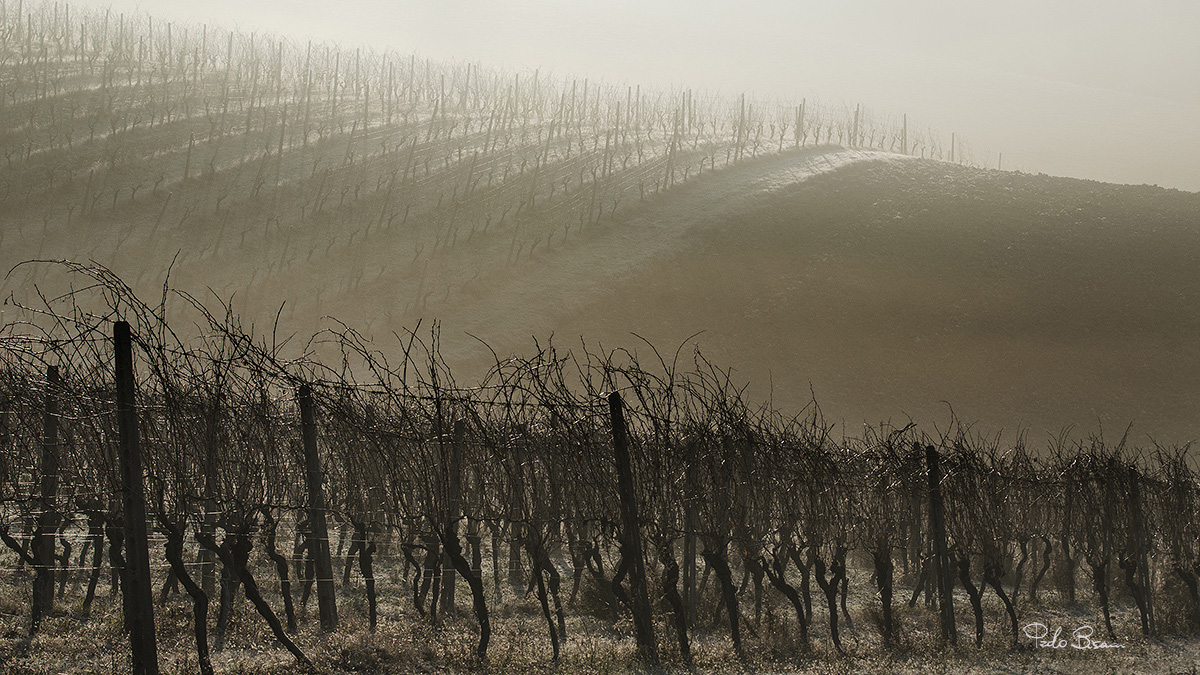 Scarna, naturalmente desaturata dall'inverno nelle cromie, forte di duri contrasti ,fra vitigni alti in trasparenza, e rete fitta e nero di tralci in primo piano, quasi in silhouette. Foto difficile espositivamente e anche come composizione. Davvero raffinata. Stellizzo.