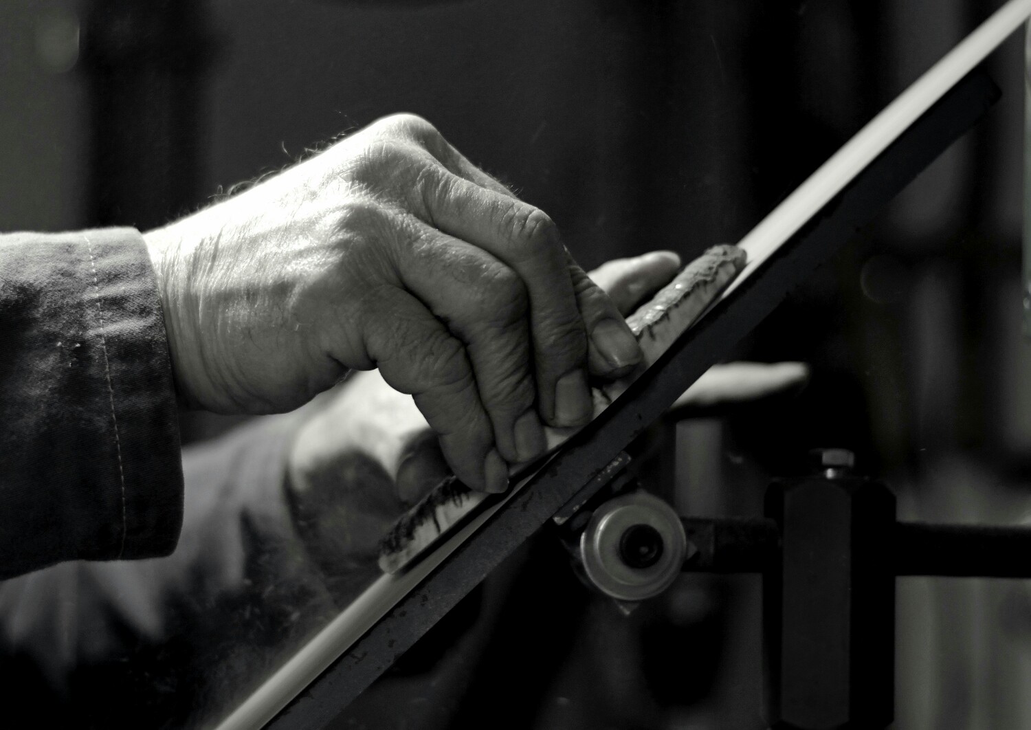Mi piace come hai composto innanzi tutto, lo strumento di lavoro posizionato sulla diagonale lo trovo efficace. La luce forte e la conseguente bruciatura sulla mano dell'uomo inficia a mio avviso un pò lo scatto essendo appunto la mano il soggetto principale a cui ti sei ispirato. Forse il B/n tende un pò al grigio ancora , come altre tue proposte. Il momento colto mi piace . Un caro saluto Ciao