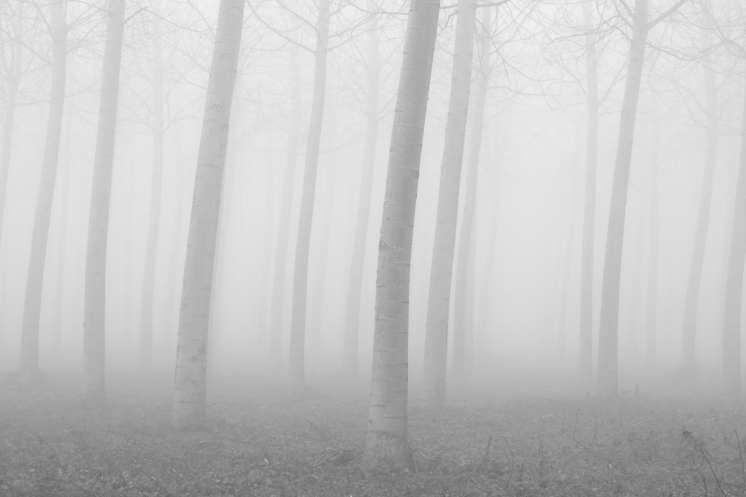 Una ripresa che non si ferma alla sola, delicata , verticalità estesa dei tronchi, ma comprende anche i primi rami sottili che da questi partono in orizzontale a comporre una chioma che , fuori campo, andrà idealmente a sondare il cielo e cercare la luce. Soffice e lattea al punto giusto.