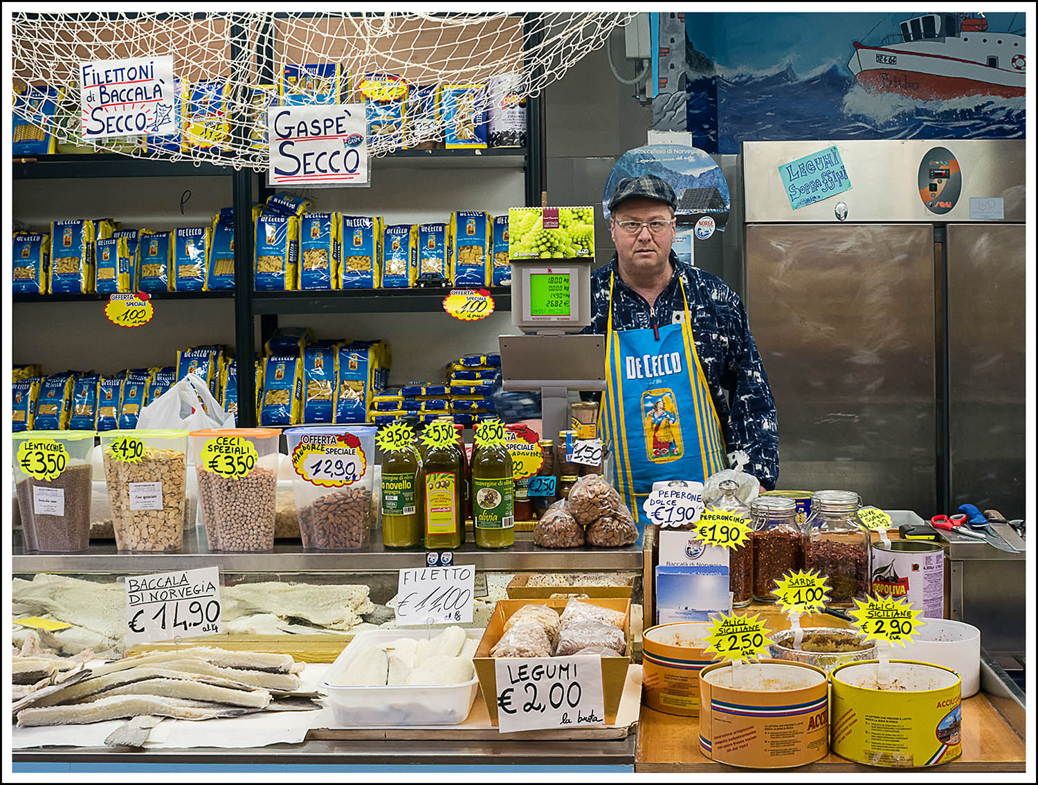 Lui non mi pare proprio convincente...: ma non vuole esserlo, si limita ad esporre il suo ben di Dio e, in caso di indecisione ,ci sono sempre baccalà e olio extravergine!