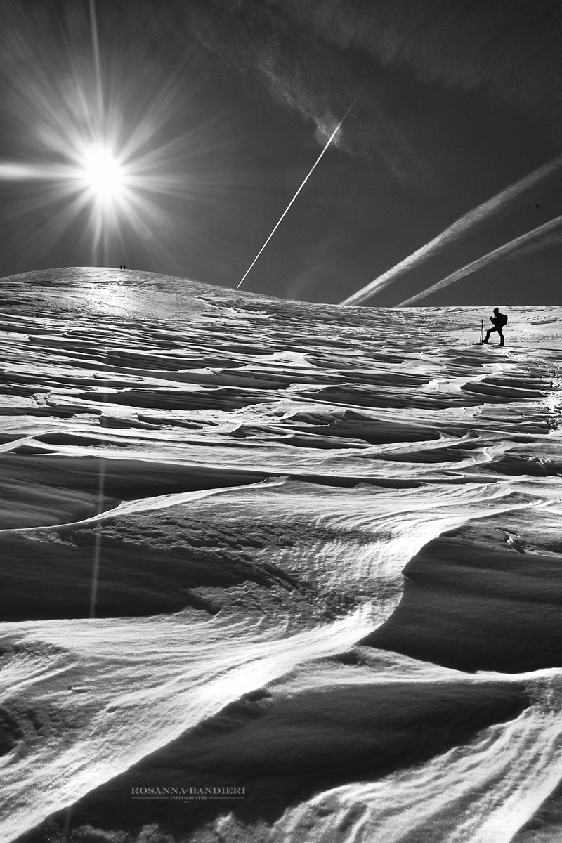 Un piccolo protagonista, che contempla un sole alto, immenso,  e con una raggiera di discepoli  luminosi,che sfiorano il pendio, ma  senza alterarne la lucida , fredda bellezza. Le scie in quota amplificano la maestosità dell'insieme. Davvero di grande efficacia.
