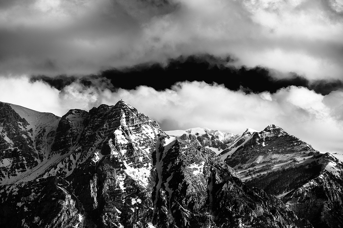 molto bella Luca, notevole il dettaglio , la piccolissima croce che svetta sulla cima della montagna si legge benissimo. Il BN è dosato benissimo a mio avviso ed è bellissima la fenditura nella nuvola sopra le cime innevate.