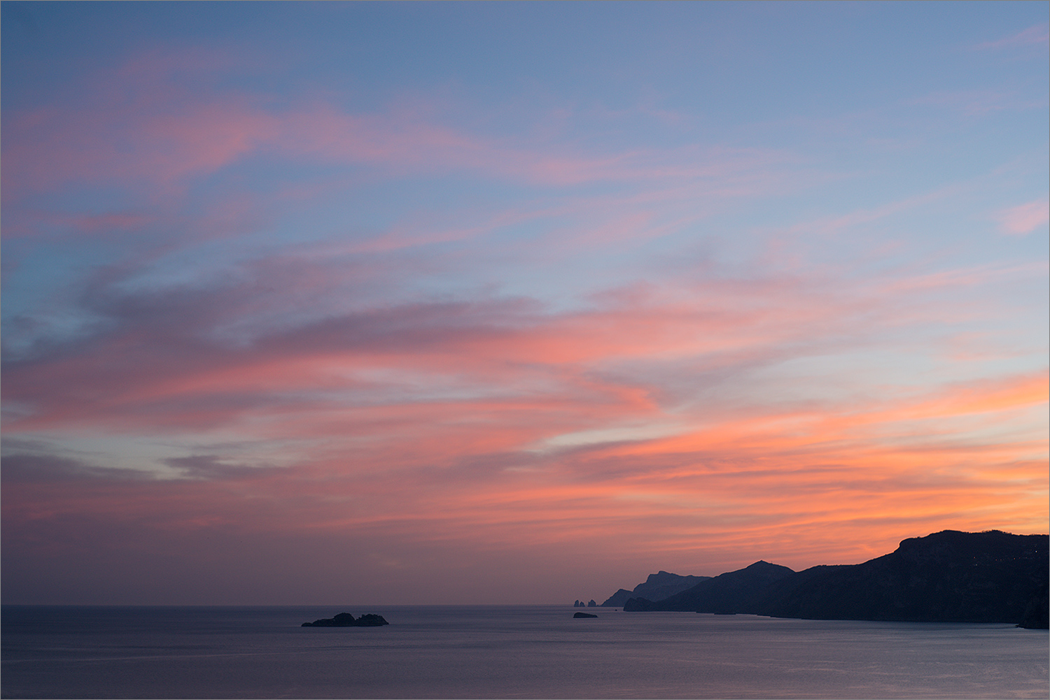 Ogni tanto rispunta il Massimo paesaggista e io mi compiaccio regolarmente. Un cielo ampio, altissimo , e ricco di innumerevoli sfumature di colori del tramonto. Quasi un senza luce, su cui le silhouettes delle coste , e sopratutto le minuscole ma caratteristiche emergenze rocciose in sfondo, tracciano la loro presenza, ma non ancora nel nero più assoluto: indugiano appena in una oscurità gentile.