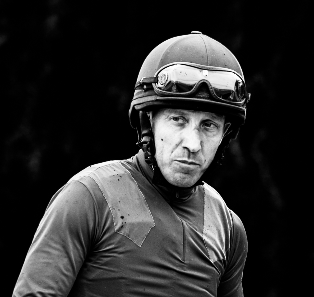 Pur con un eventuale problema di fuoco o, cmq, pur con una resa poco materica e consistente (che avrebbe elevato tantissimo la qualità di questa particolare immagine) trovo che questo fantino abbia livelli di espressività dal potenziale enorme o, per lo meno, lo sono in questo particolare momento colto: inclinazione del corpo, quello sbilanciamento alla nostra dx ma nel contempo lo sguardo è dalla parte opposta e poi quella maglietta, gli calza "a pennello" coerentemente con la struttura che ci si aspetta da un fantino. Insomma questa foto è capace di raccontare esattamente chi abbiamo di fronte e quale sia il suo ruolo, pur con l'assenza del puledro e di altri elementi distintivi tipici. Insomma, questo E' un fantino e si vede. Ed è proprio quella postura che evidentemente ci richiama implicitamente che in questo momento deve essere proprio sul suo cavallo.