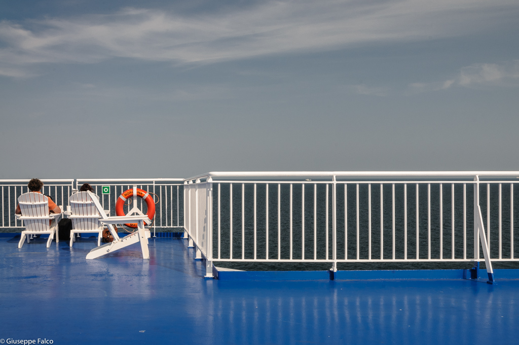 Una foto ben colta e congeniata. I protagonisti che osservano il mare lontano in relax, nelle candide sedute. Mentre un invisibile soggetto sembra però osservare il fianco della scena, sulla sedia vuota posta a 90 gradi rispetto alla coppia. Sedia che hai colto nel momento di scatto, non certo posta ad arte da te in questo modo ( magari la avresti addirittura spostata potendo) , eppure introduce una nota carina. Simpatica questa importanza del soggetto paesaggistico: le gradazioni di blu, il vasto orizzonte marino, come racchiuso dalla ringhiera orizzontale, una nave come un giocattolo, che sembra solcare però il binario tubulare della ringhiera stessa; e poi il rapporto di peso fra le geometrie in bianco e la partecipazione umana, reale e ipotetica-invisibile....