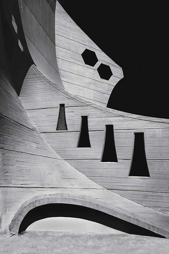 | Bell'esempio di come una architettura particolare possa essere ripresa in maniera differente rendendo sempre al massimo delle potenzialità..  Già ci avevi fatto vedere parte di essa con un cielo blu importante, ora è il b/n a fare da padrone e a rendere il tutto molto più particolare.. Il cielo completamente nero è una incredibile tavolozza su cui appoggiare il tutto, e non è affatto casuale la gestione degli angoli e delle linee, quella curva che va a chiudere in alto a sinistra è da manuale..