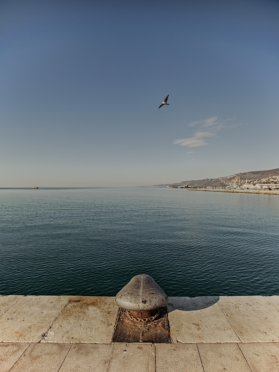 La resa dettagliata e pulita, la composizione verticale con bitta centrale, il momento propizio con il passaggio solitario e strategico di questo volo libero...