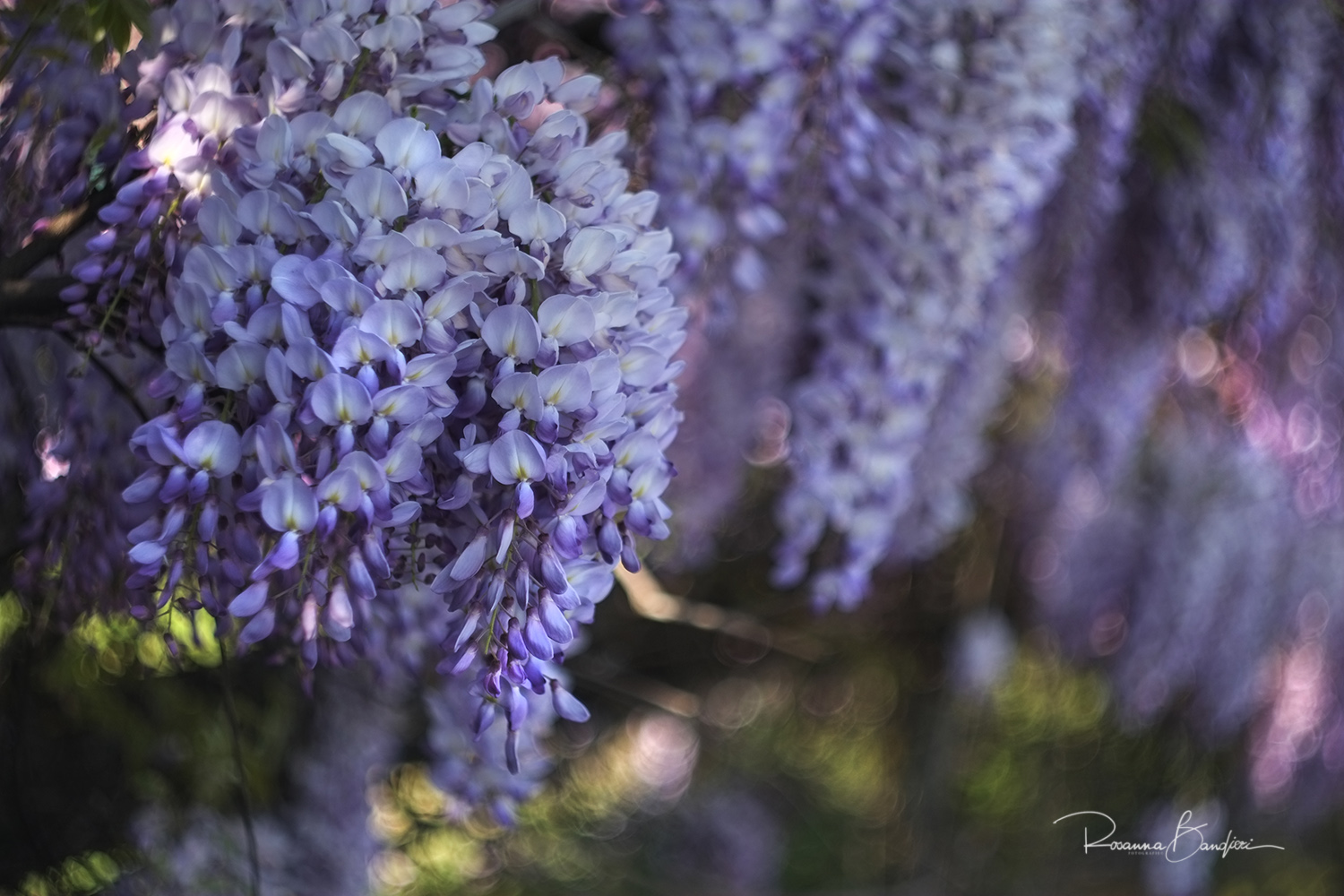 Festoni verticali di fioritura primaverile, in un baligiare di chiaroscuri fra i petali...