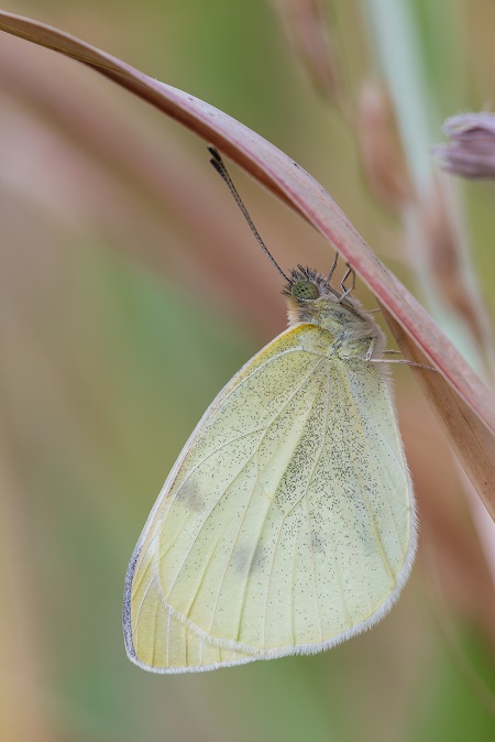 Foto serale di una Cavolaia maggiore, che si è sistemata appesa ad un filo d'erba, dove passerà la notte...