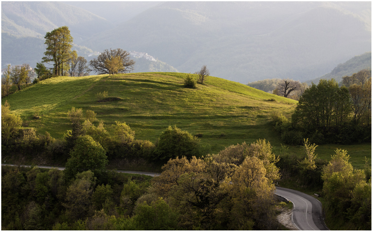 Paesaggio naturale, strada e alberi senza elementi di disturbo, inquadratura stretta ma efficace