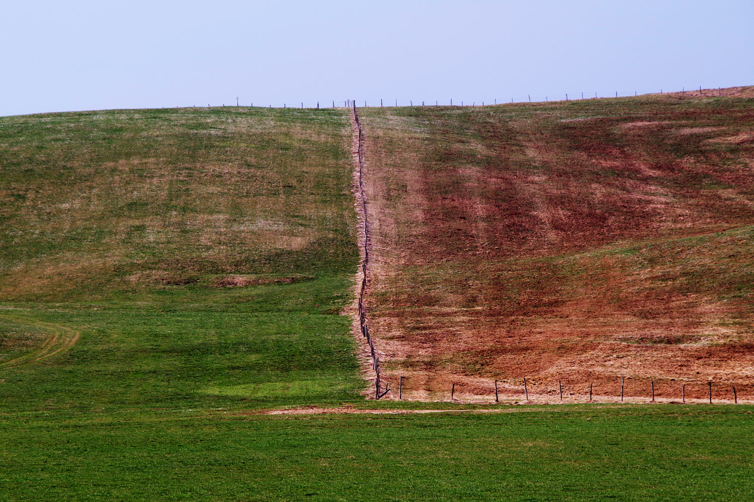 Mi sarei fermata alla matericità delle due parti di terra, con quella curvetta a binario nel verde, con la L di paletti che ascende , e le belle sfumature di colore. Questo perchè non c'è parità di interesse fra la parti in campo, e il quadro finale ha come una parte irrisolta; la presenza della apertura di azzurro, in parte distoglie dalla osservazione del dettaglio inferiore, e fa correre lo sguardo ad una apertura che lascia un poco insoddisfatti, a cercane qualcosa che non può esserci.