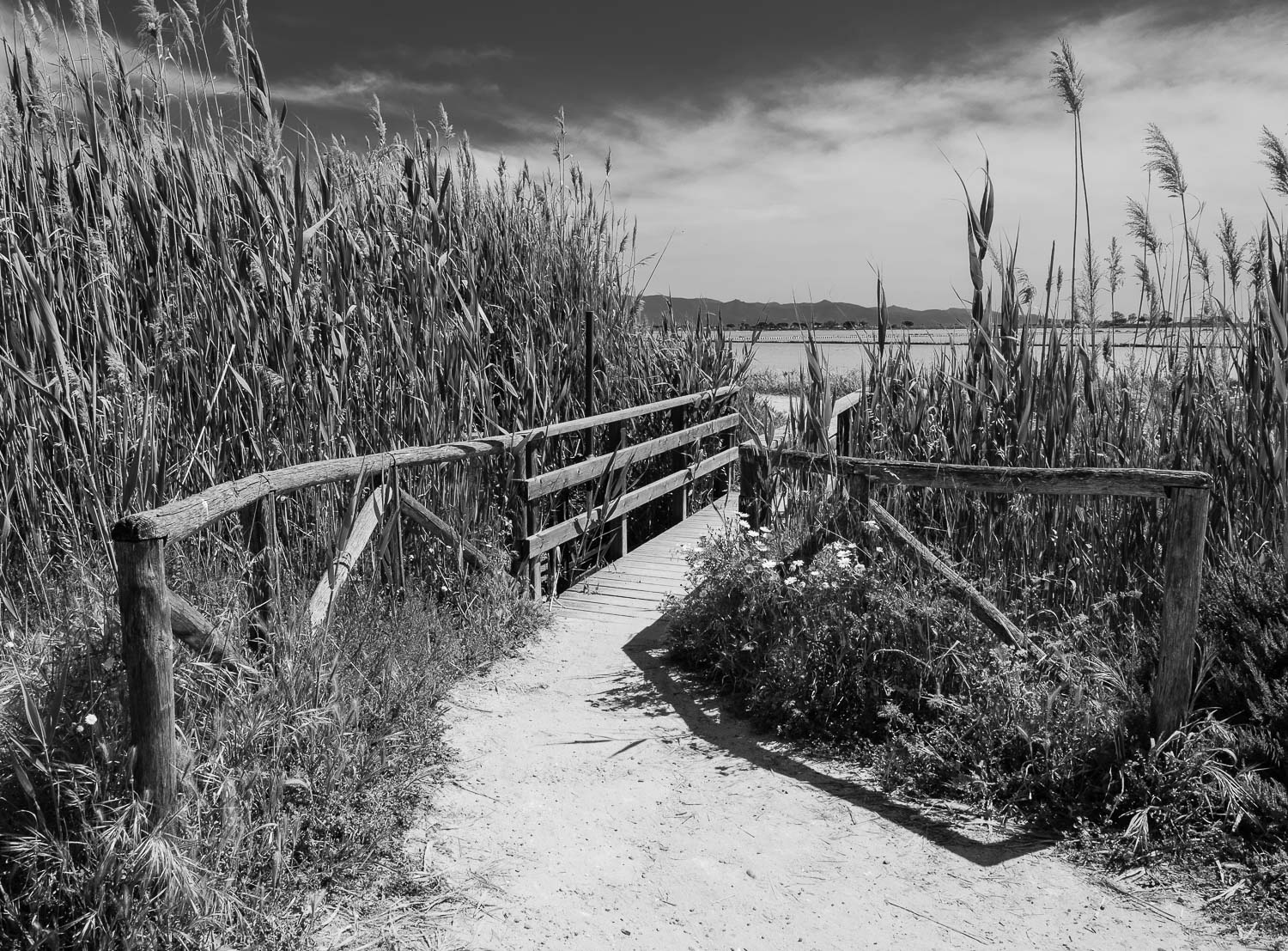 Mi piace questo scorcio compositivo, con la curva del sentiro sabbioso, trtto fra i corrimani, che porta al mare aperto oltre le canne. Mi convince meno il bianco e nero: la scena assolata è avvolta da una luce intensa, eppure qui risaltano solo i grigi, sia nel cielo fra lke nuvole, che nelle posizioni dove ti attenderesti bianchi brillanti. C'è dettaglio, ma manca un equlibrio fra bianchi, veri neri e grigi .