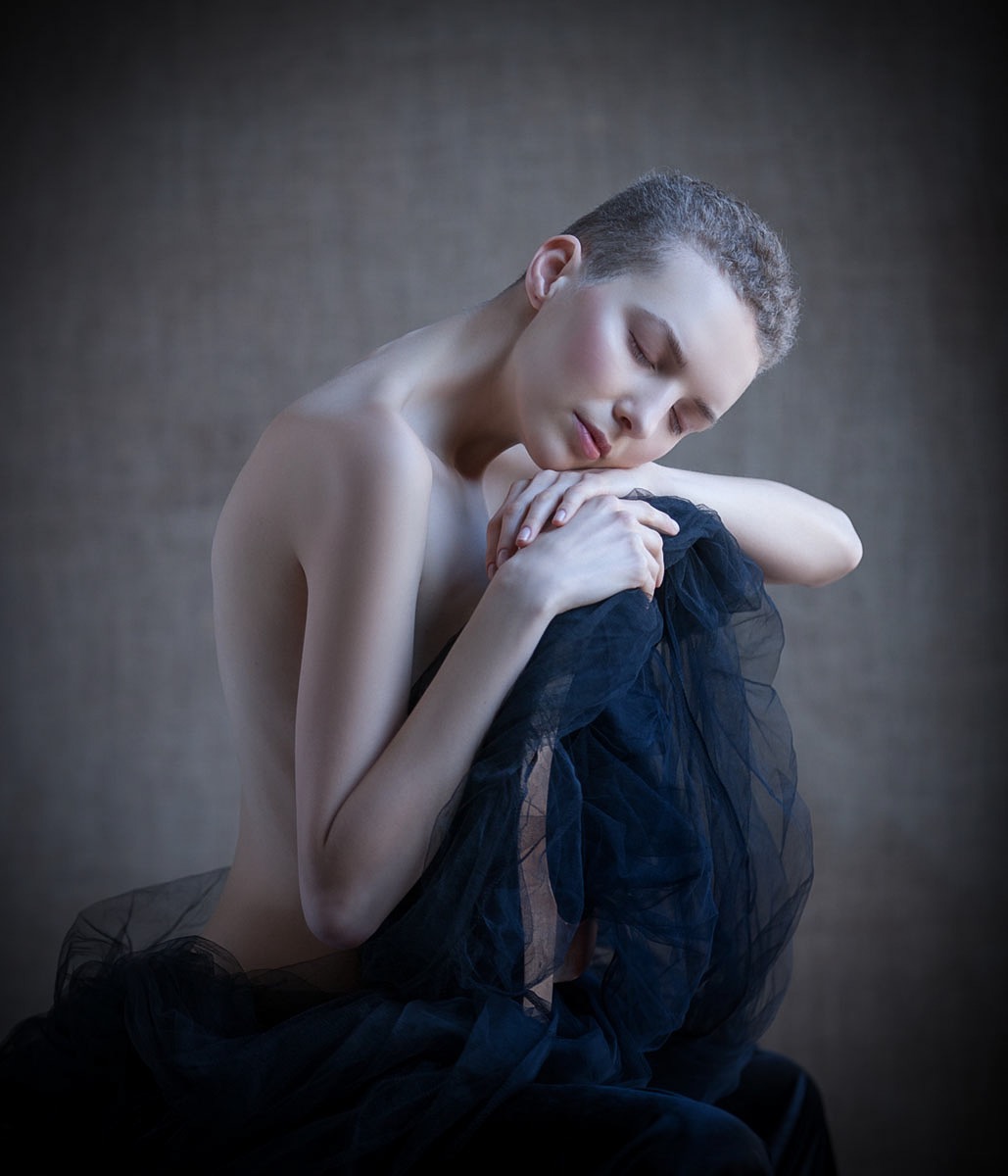 Mamma che bella! Un incarnato da favola e poi questo collo degno di Modigliani. Molto piacevole il contrasto e lo stacco dei colori caldi della pelle con il tulle scuro e freddo.