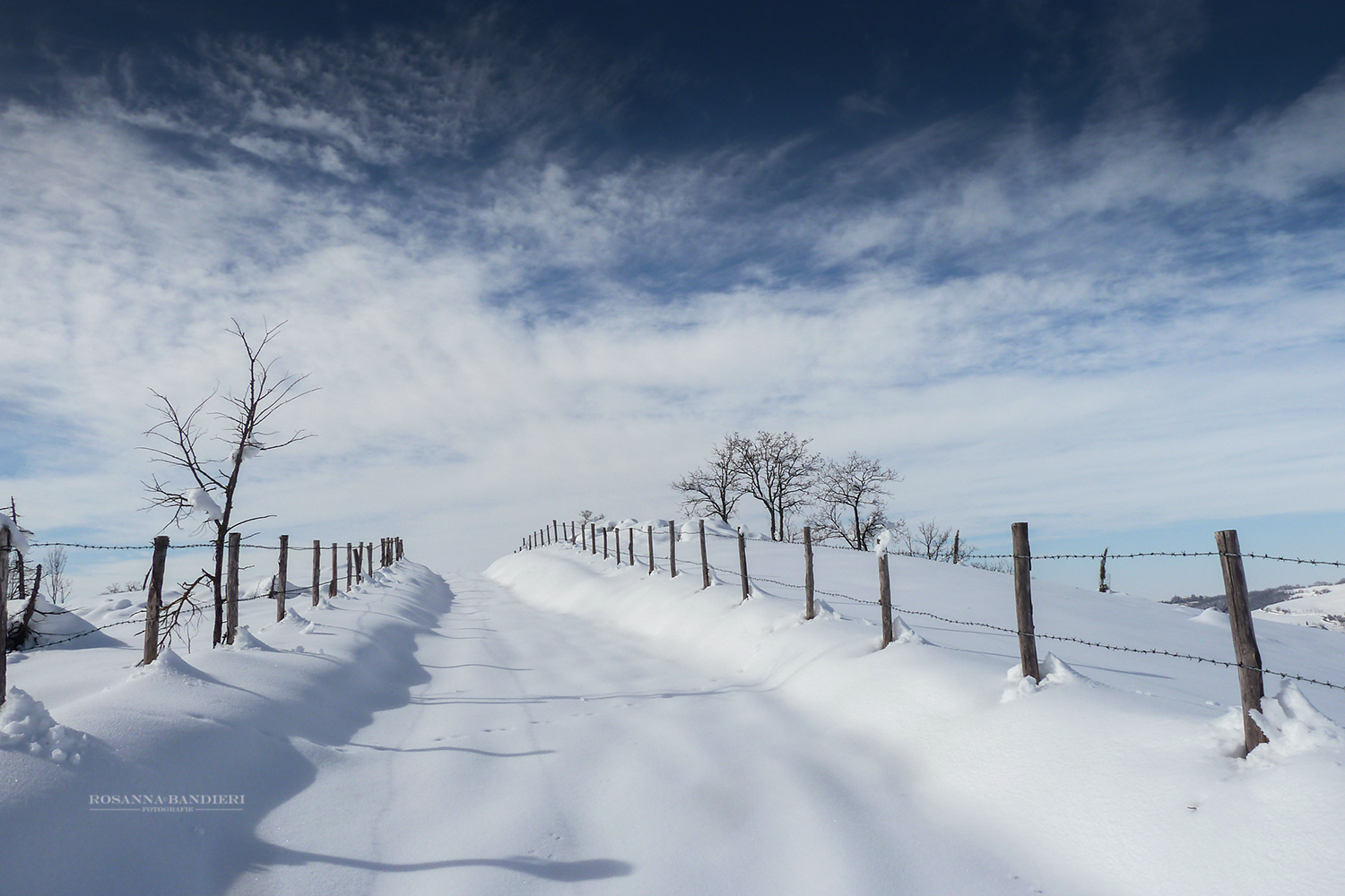 Una passeggiata davvero emozionante, e ce ne fai condividere in parte candore e freschezza. Il cielo che si addensa nel blu in alto fa da contraltare alla morbidezza bianca del cammino. Ben resa, e composta... Molto bella.