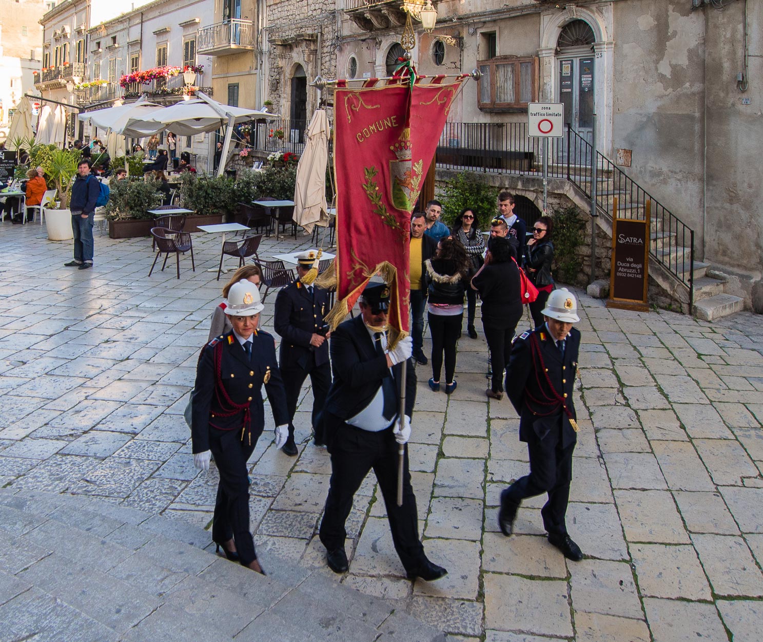 Meritava lo scatto, questo è certo, mostra la scarsa comunicazione fra istituzione e cittadini, l'indifferenza del ''popolo'' al passaggio delle alte cariche comunali, in alta uniforme con tanto di gonfalone è lo specchio dei tempi, la pancia all'aria del portabandiera arricchisce la scena, aggiunge quel pizzico di ironia a una situazione di vuoto sociale..peccato che la figura del sindaco sia totalmente coperta.