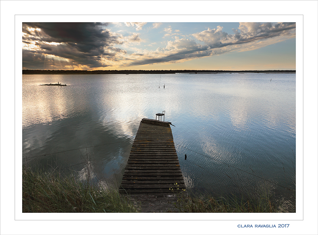 Il pontile, la bella luce ed il bel cielo che si riflette sulle acque calme mosse da un fremito di brezza. Al centro troviamo lei, la protagonista di questa bella immagine, la sedia.