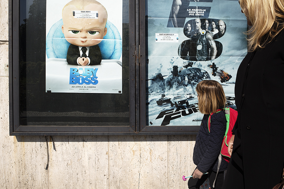 La foto avrei potuto intitolarla "Interessi diversi", infatti sembra che la donna sia attratta dal cartellone con l'uomo muscoloso mentre lo sguardo della bimba è rivolto verso il cartellone del "baby boss".