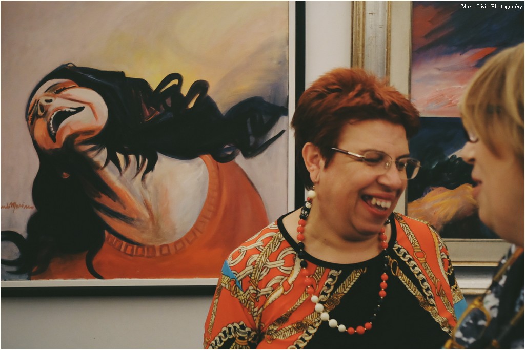 La ( non facile da cogliere, e fortissima) similitudine della risata piena fra donna e quadro , si completa di un bel gioco concorde di colori arancio.