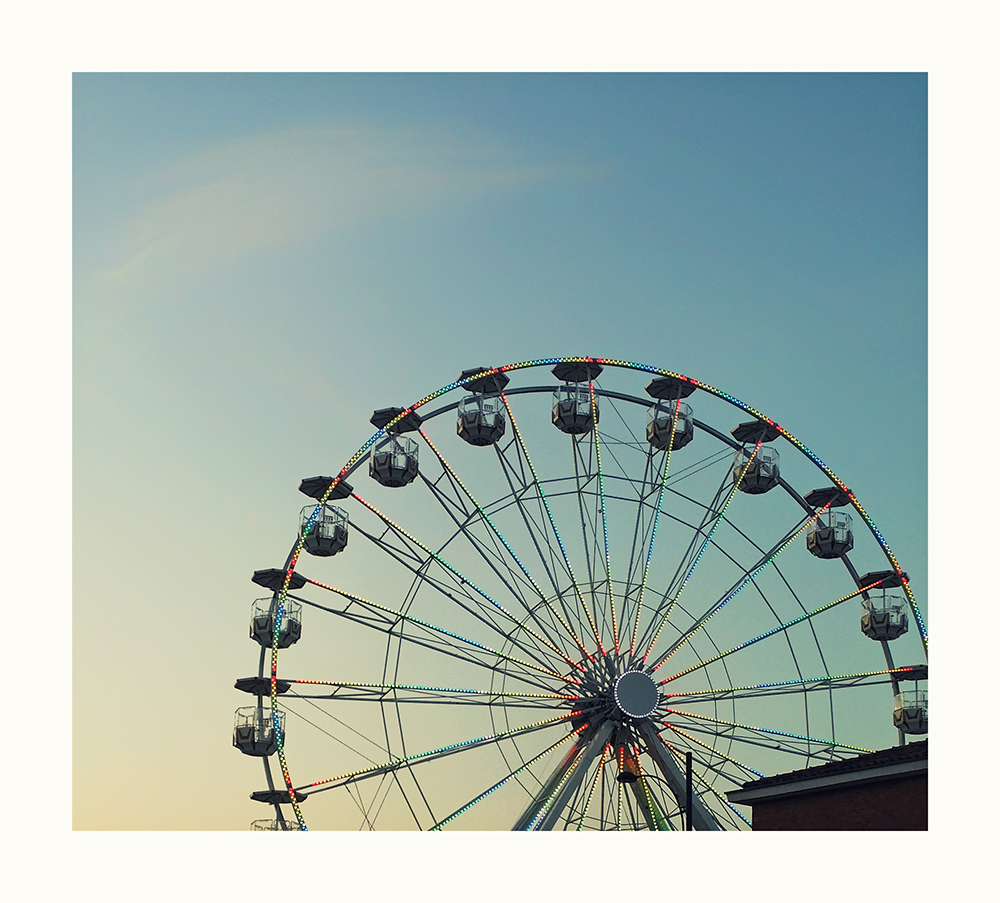 Questo taglio inusuale co mostra la struttura della ruota panoramica in veste diversa e devo ammettere che cosi' ripresa mi ricorda la ruota di bicicletta mentre viene bilanciata.