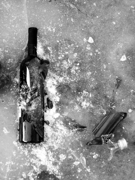 Io vedo una foto interessante, mi piace l'idea dell'impatto che fa implodere il vetro, qui ben rappresentata. se non erro il vetro è ancorato nel ghiaccio, il tutto verrà spazzato via quanto prima. Avrei voluto vederla a colori.. giusto per riconoscere le sfumature..