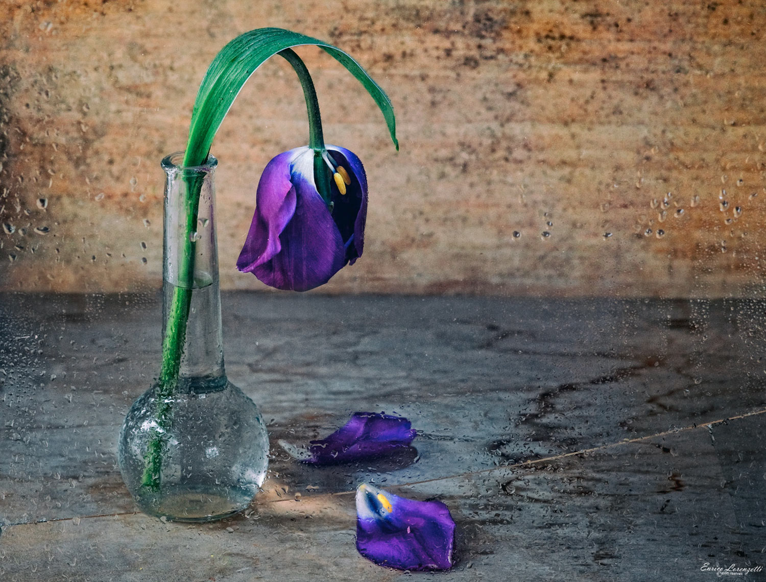 Lo sfondo e la ambientazione sono tutte giocate su tinte beige discrete, se non addirittura leggermente sombre, ma fiore e stelo e petali caduti, invece brillano, come le gocce di pioggia, di luce e vivacità, nonostante il mesto inchino.