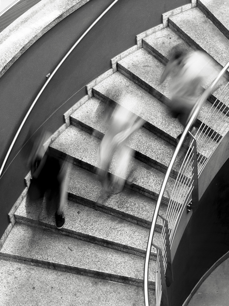Punto di ripresa e tempo lento elementi determinanti alla riuscita di questa suggestiva immagine che risponde perfettamente al titolo.Belli anche il bn e la composizione che accompagna sulla diagonale il movimento della scala.Complimenti! Ciao