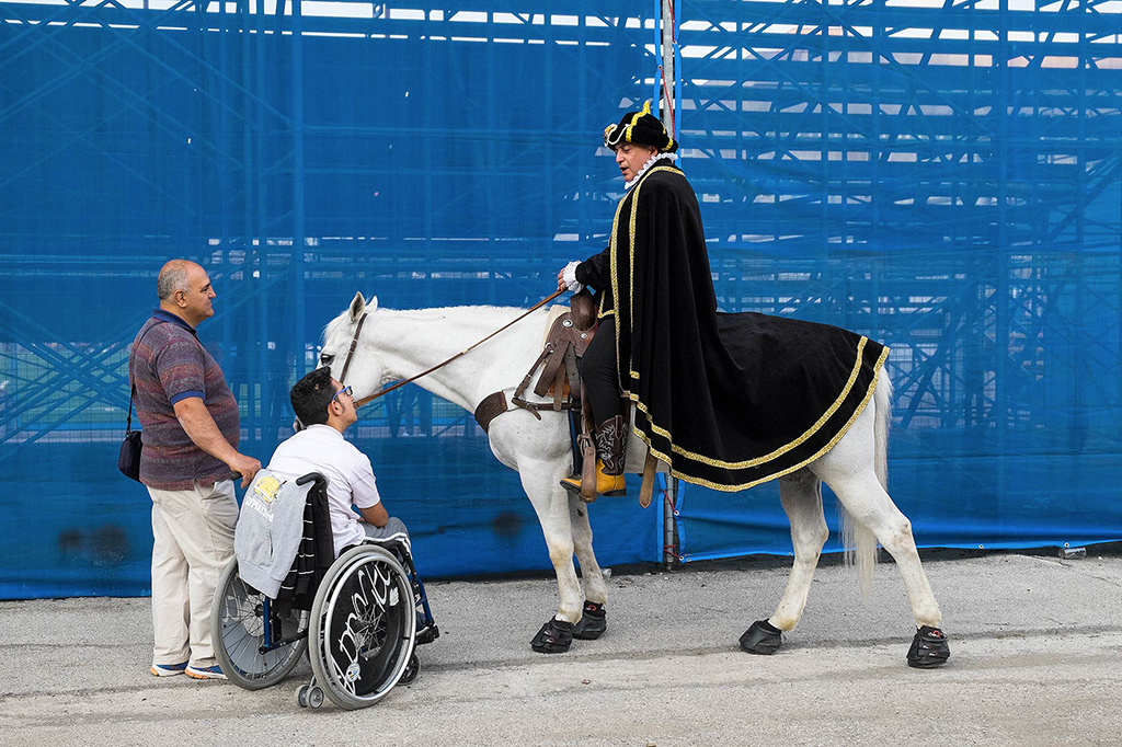 Non riesco a capire il motivo dello scatto, due persone che parlano con un figurante di qualche rievocazione storica, lo sfondo dovrebbe essere il palco o le gradinate per il pubblico.