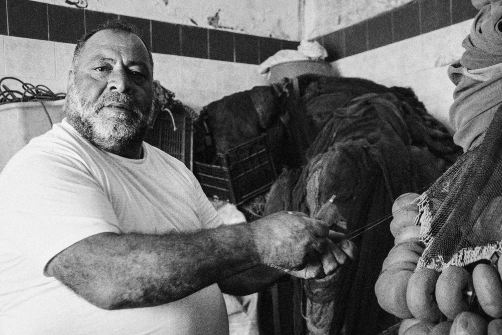 Un gigante curatore di reti... Per questo immenso pescatore, anche i bianchi straripano e i neri si fanno potenti. Ritratto ambientato, come perso nel tempo, polveroso e denso.