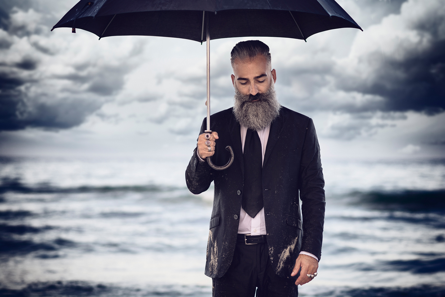 La tempesta non è solo in lontananza. La tempesta sembra essere dentro di lui. Con il suo look contraddittorio ma distintivo; in atteggiamento riflessivo e distaccato ma allo stesso tempo attento e scrupoloso tanto da essersi premunito di ombrello.