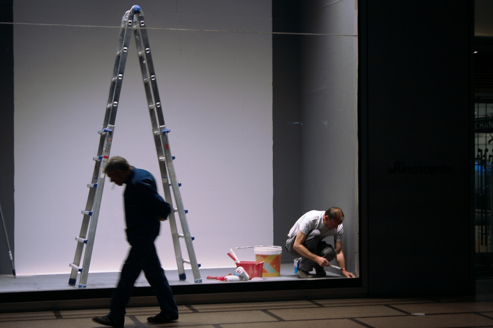 Testa in giu0 ok, ma soprattutto il passante colto nel triangolo della scala e' una bella cattura e il suo passaggio indifferente contrasta con l'impegno dell'altro soggetto al lavoro.