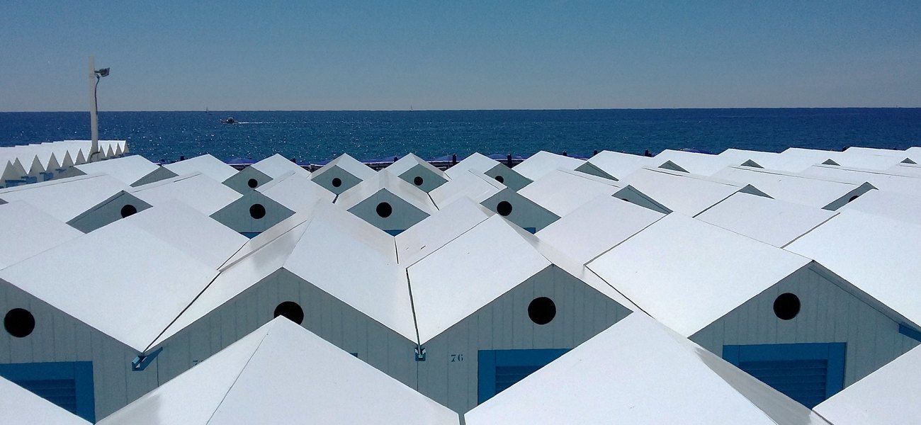 Mi piace molto. E personalmente apprezzo la compo, in prima battuta , che tu proponi. Per il raffronto immediato fra geometrie di cabine e mare in sfondo. Le cupidi dei tetti come onde appuntite e stilizzate, giganti in raffronto a quelle inifinitesimali e reali della distesa d'acqua. E òpoi il gioco di risposta cromatica fra il blu cobalto dell'acqua e i porlati carta da zucchero delle porte delle cabine.