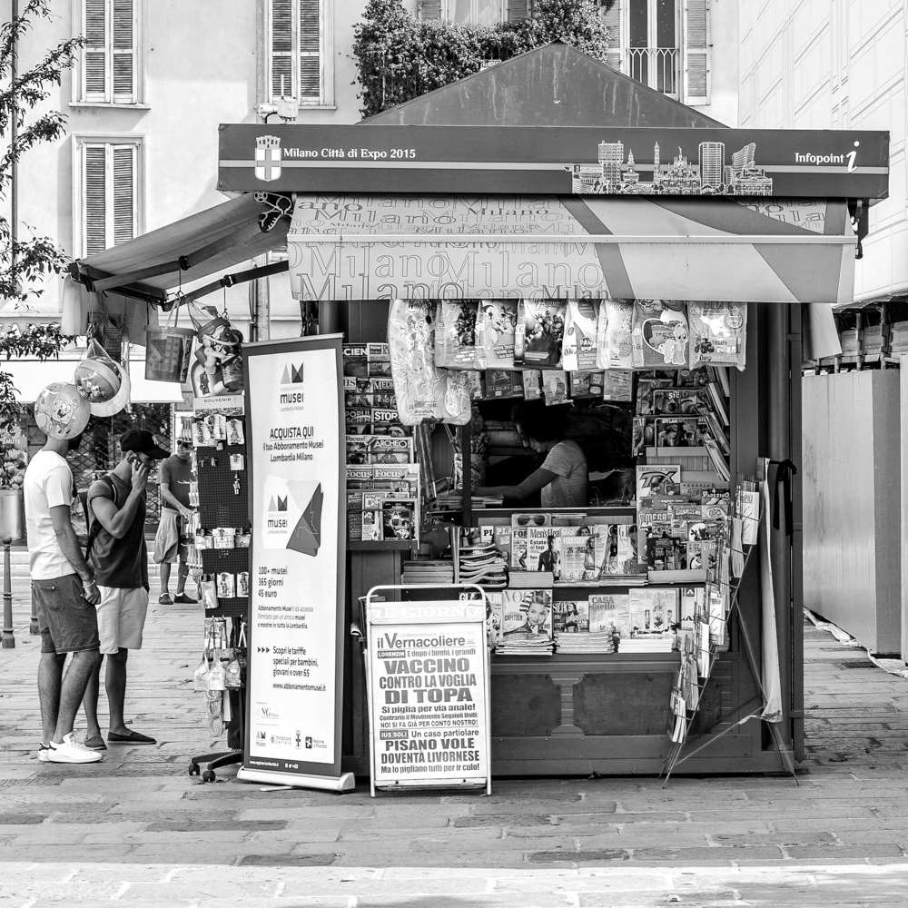 Fotografarlo in questo contesto privo di qualità (ossia un'edicola in città più qualche persona sparsa...) oltre che privo di eventuali "agganci" (ciascuno immagini quello che preferisce) con il titolo suddetto (il quale - piaccia o meno - rimane pur sempre il "cuore" della foto) non trovo che senso abbia, in termini fotografici.