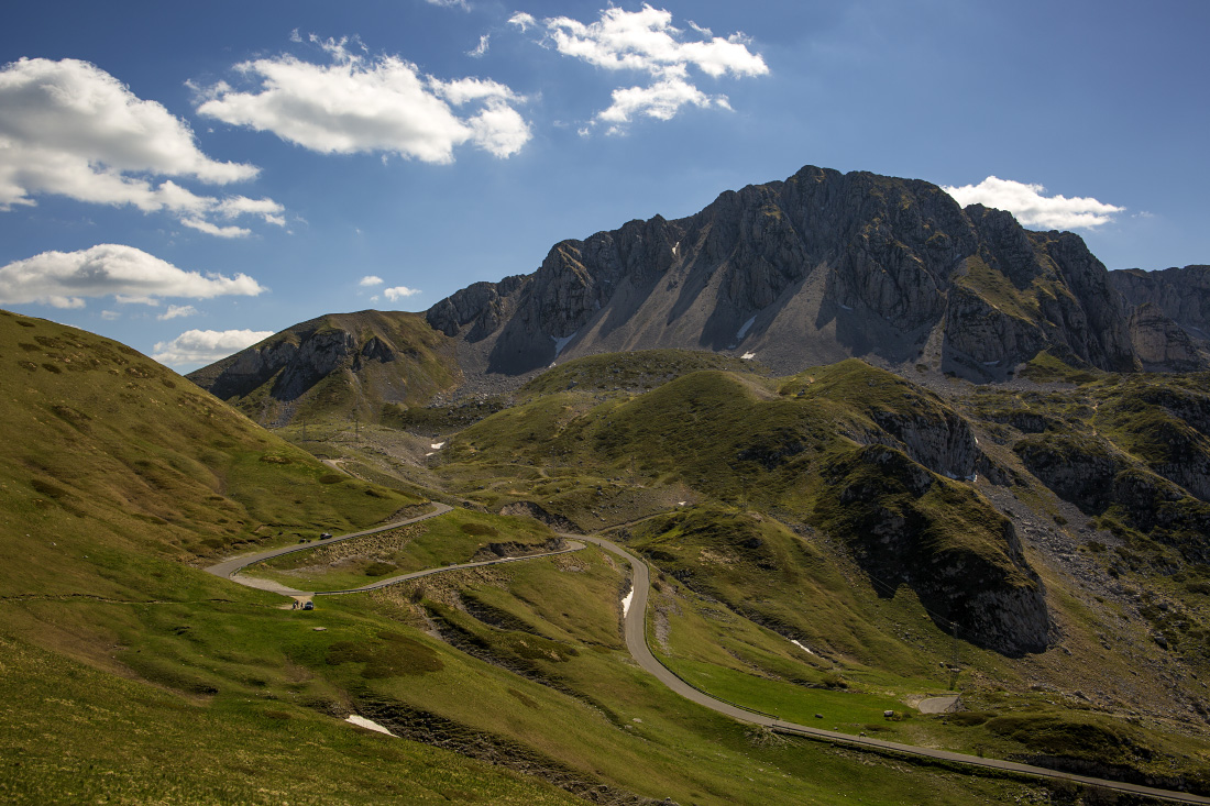 Ben nitida in luce brillante, la strada che serpeggia, fra i pendii e con piena luce, ad un passo.... ( e ben la partenza precisa all'agolo inferiore destro. Si distinguono mille particolari in dettaglio dai rombi (di neve residua? )nelle rocce più ripide in ombra, fino alle macchinine ferme in piazzola, per una sosta all'aria aperta. o in progressione per via. minute note, che la allontanano da una pur degna ma più banale cartolina.