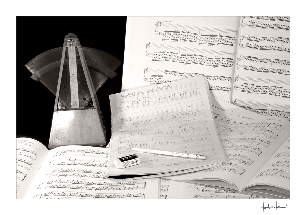 Riguardo lo scatto, dopo innumerevoli prove con tempi, luci e diaframmi vari, questo risultato deriva da un illuminazione da due sorgenti, una quasi frontale e una più laterale da destra, più flash sincronizzato su seconda tendina (si dice così?), tempo 2,5sec., diaframma 32 e ISO 200. Difficile era sincronizzare il flash al punto morto a sinistra del metronomo. Ma da buon musicista, trovare il tempo giusto è fondamentale...  _________________ Federico Ferrari