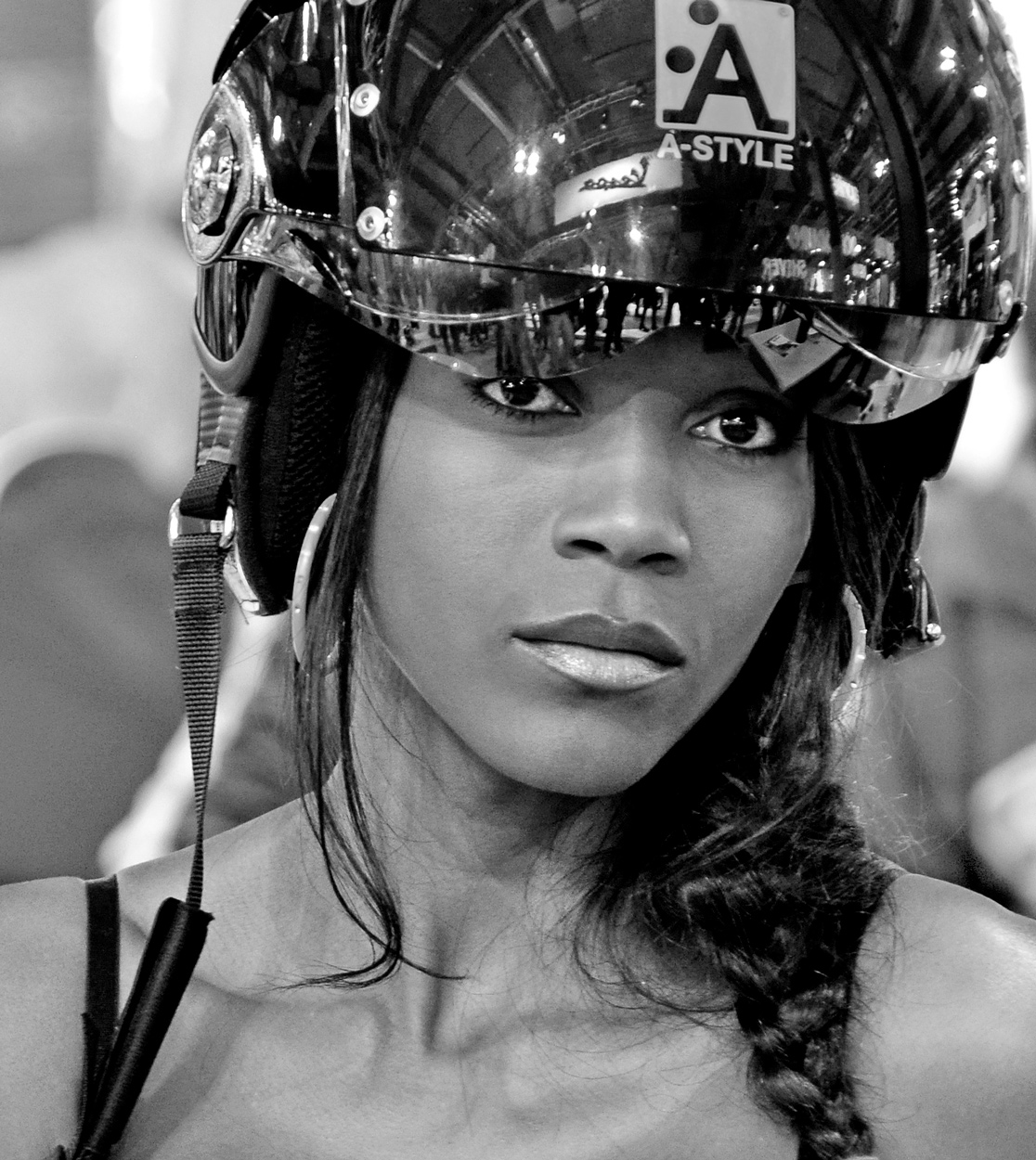 Una bellezza quasi cibernetica che emerge dal tecnologico casco in un magnifico bn.Mi piacciono molto anche i riflessi che contestualizzano questo splendido ritratto.Complimenti! Ciao