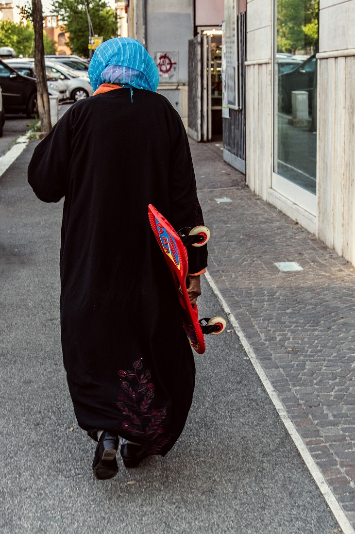Oltre all'improbabile accostamento "anziana in djellaba - waveboard", sono perfetti i colori arancione e turchese del copricapo e del mezzo di trasporto (testa-piedi, insomma).