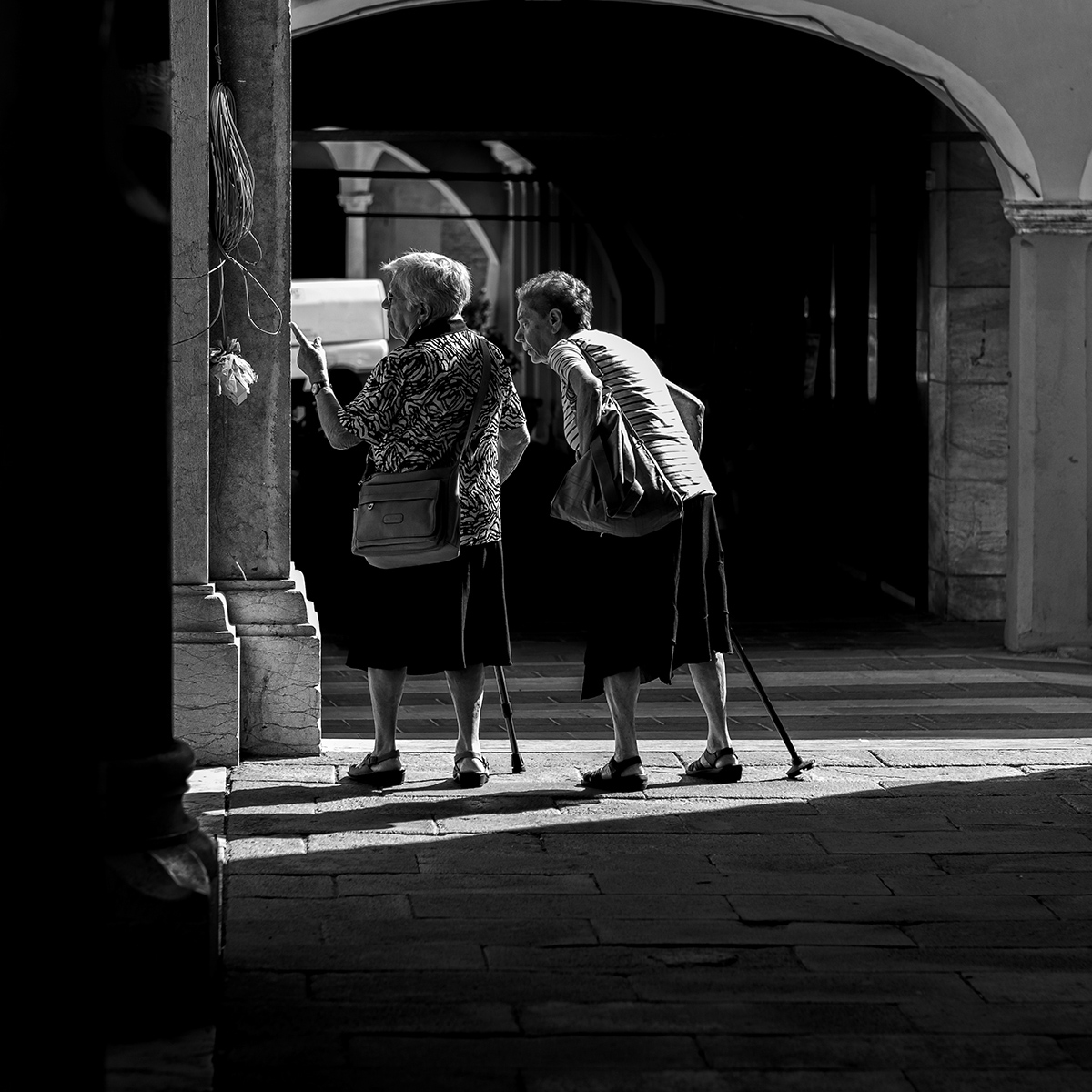 Molto bello, il momento che hai catturato, per l'espressione incuriosita delle due signore. Peccato per il pezzetto di arco che manca, ma è poca cosa. È buona anche la gestione delle luci, in uno scatto non semplice, per i forti contrasti.