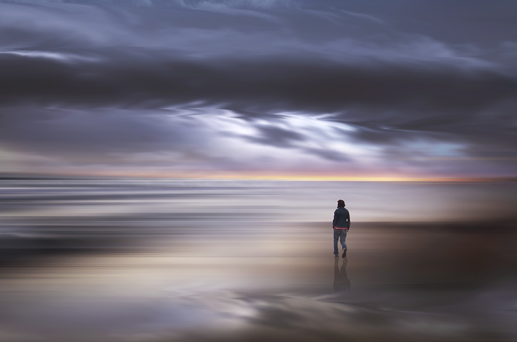 Un tuo classico in questo paesaggio d'effetto movimento che , a differenza di altre prove (per questo la trovo intrigante) rende la parte sottostante un vero e proprio specchio di confronto tra cielo e terra, uomo e la sua ombra. Sensazionalmente metallico, ferroso l'effetto colore che mi riporta a qualche vecchia interpretazione cibernetica . Sempre molto bravo.  |