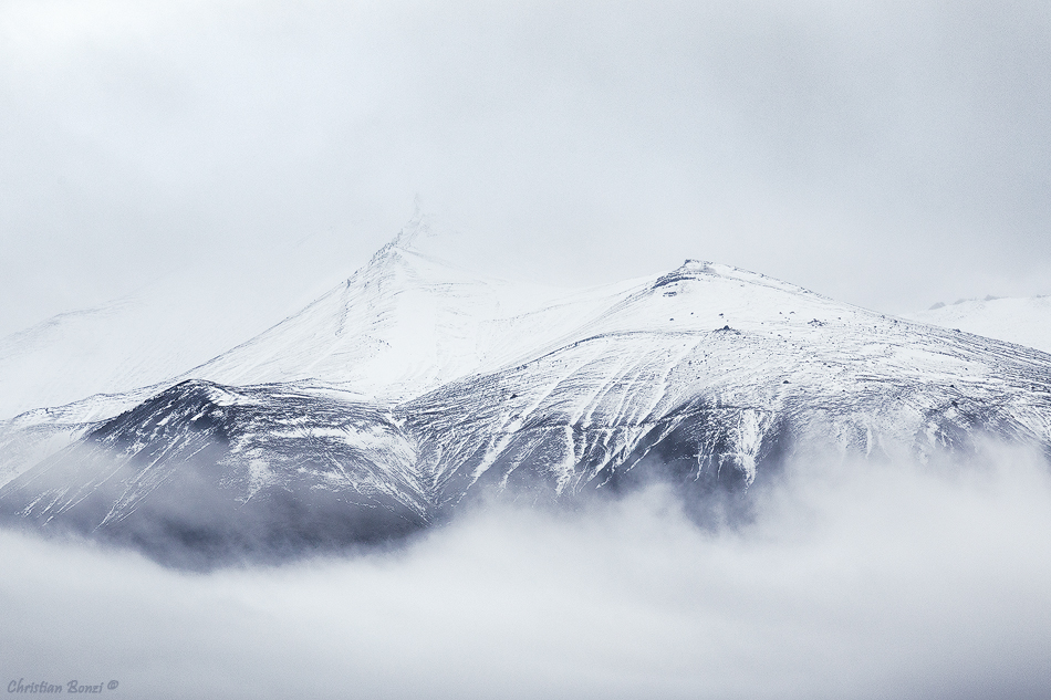 Maestosità leggera, velata di nubi sottili e con un elegante alternarsi di roccia nuda e nevi in quota. Una interpretazione della montagna che rispetta la sua grandiosità ma vuole estrarne anche la lievità.
