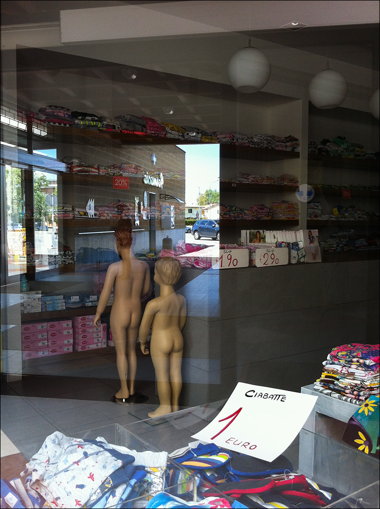 In un negozio di abbigliamento i poveri manichini stanno nudi fra gli scaffali di merce. Una contraddizione ben colta e raffigurata