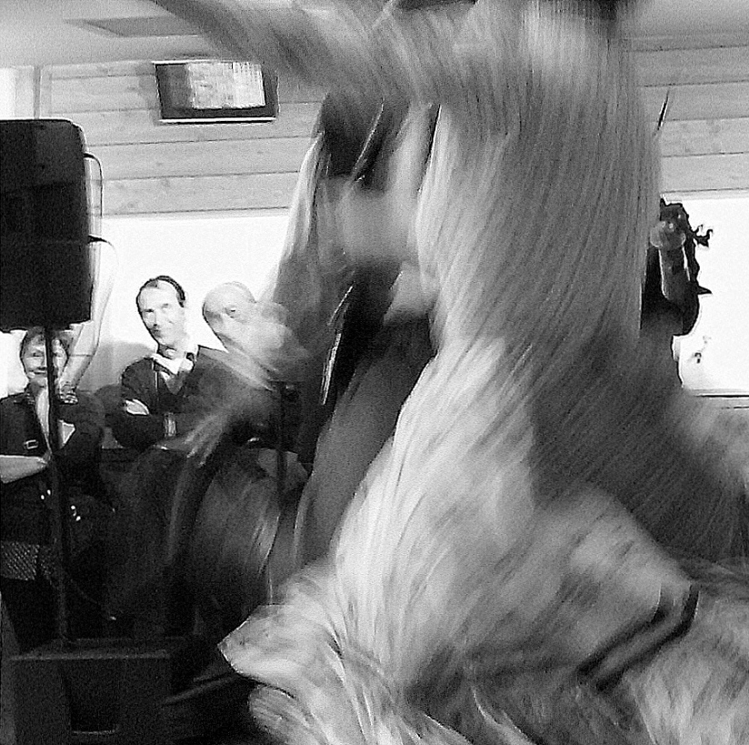 Se di primo acchito avrei anch'io scelto per il taglio suggerito da Tina, per rigore e capacità di focalizzare l'attenzione sui soggetti principali (la coppia danzante e i due osservatori), riflettendoci mi pare che questa visione più ampia sia anch'essa significativa perché "il resto" pare fuoriscire dal movimento dei ballerini sparato via dalla forza centrifuga.