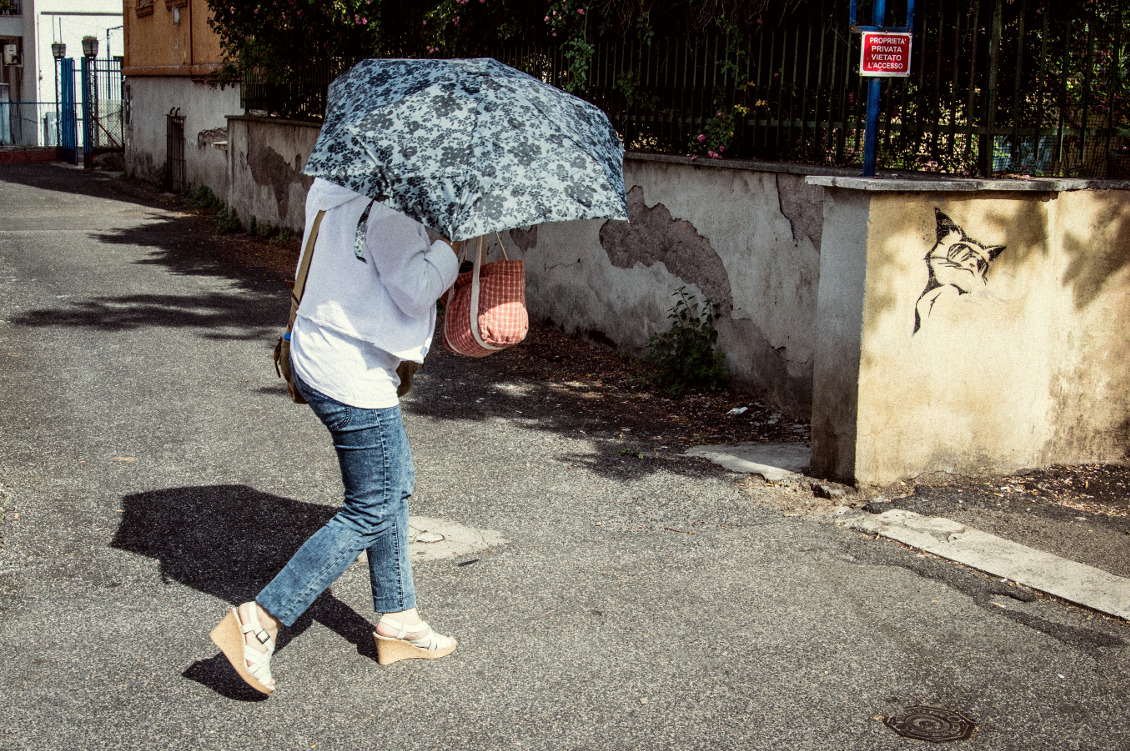 E' una foto di qualche tempo fa, i primi caldi. E l'ombrello aperto col sole mi sembrava una stranezza. Nel giro di pochi giorni mi sono reso conto, invece, che non era una mossa sbagliata. E soprattutto non è nulla di "irripetibile". Ho deciso di postarla, dopo qualche esitazione, soprattutto per la presenza del murale e dei possibili collegamenti semantici. Appigli comunque deboli.