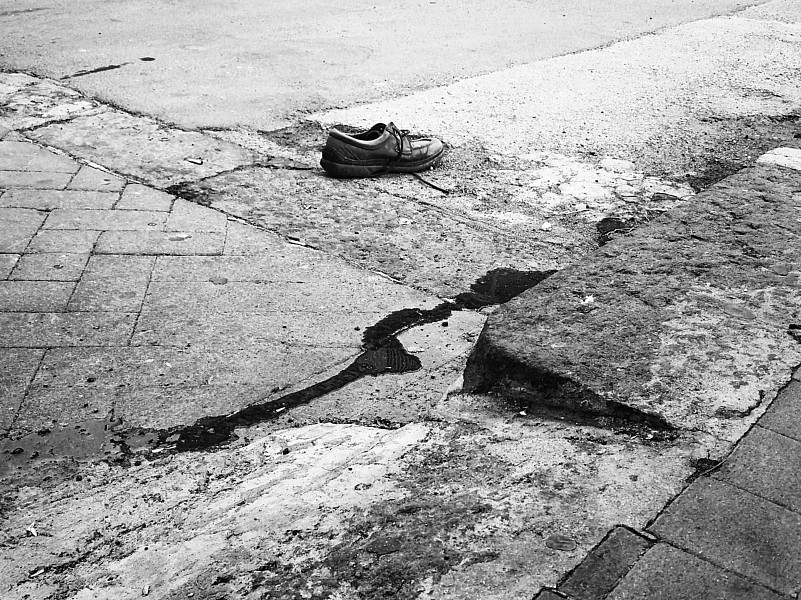 Fa scattare subito un'emozione di inquieta preoccupazione. Giornalistica e d'impatto. Sembra la scena di una tragedia mentre probabilmente è solo una scarpa abbandonata e un rivolo d'acqua (spero) Ok!