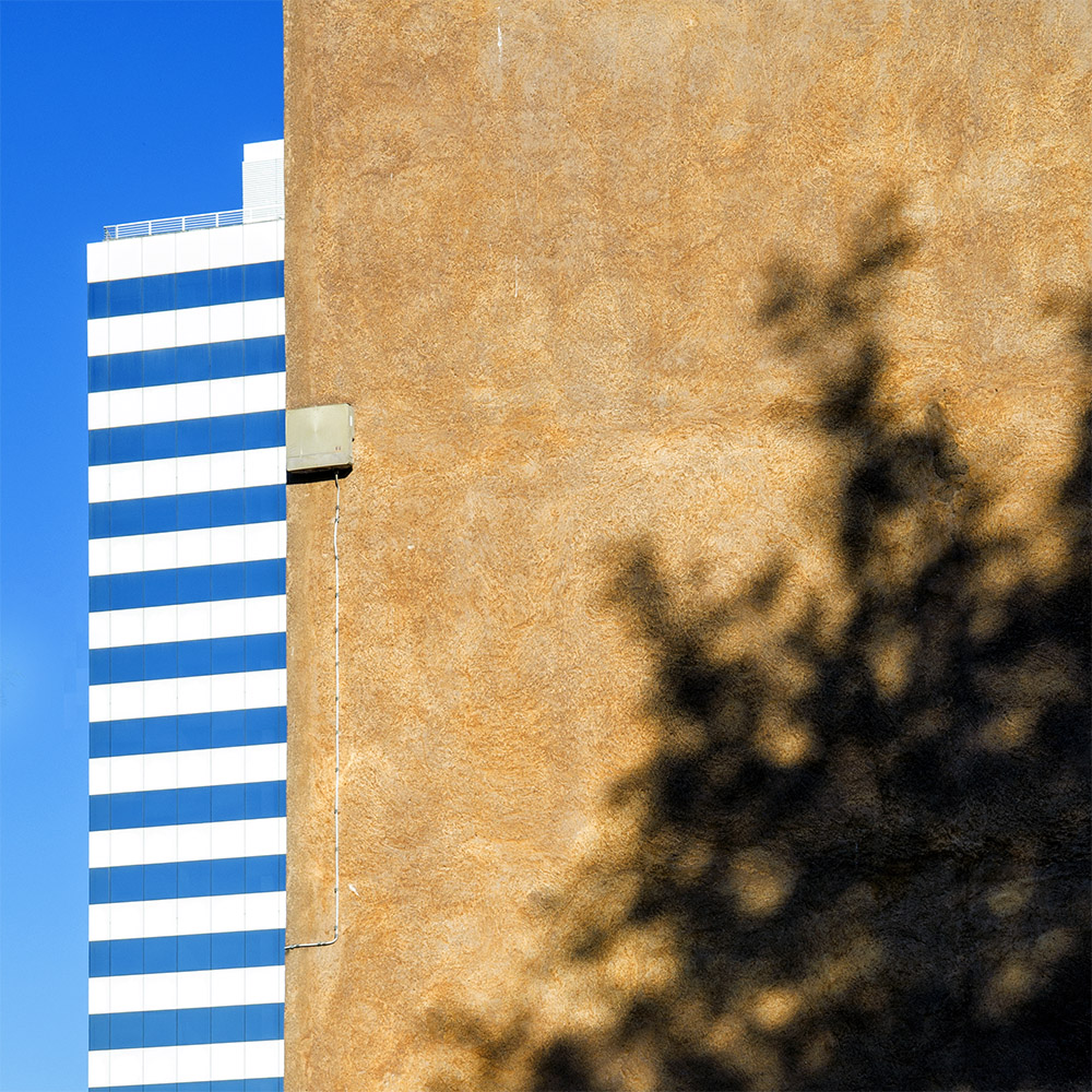 Un'Eur praticamente irriconoscibile, addirittura dal sapore balneare nei colori a righe bianco azzurre. Un bel rovescio della medaglia, in elegante formato quadrato, ma con un tocco di forte matericità negli oggetti prosaici del quotidiano, come fili e scatola elettrica, e una nota ombrosa ma calda insieme, che con la vasta traccia del fogliame ci racconta indirettamente la forza del sole..