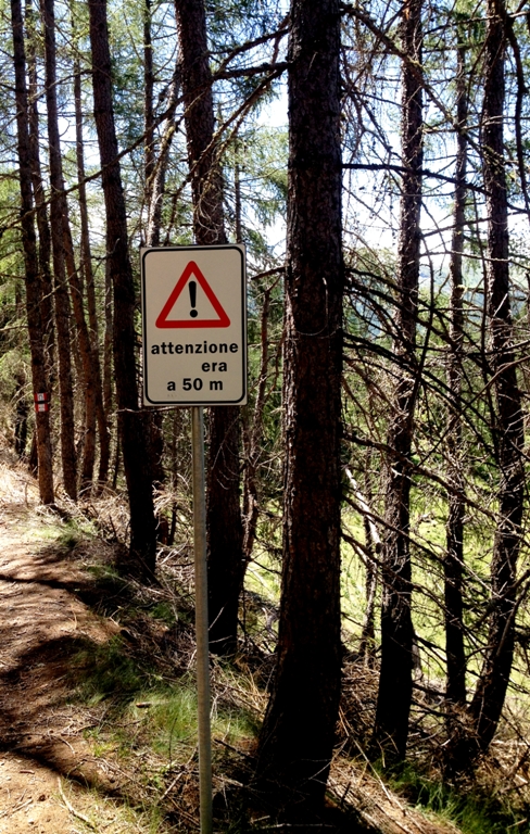 L'ingresso al bosco è delimitato da barri-ERA. Qualche buontempone si è divertito (e ha fatto anche un bel lavoro!) a staccare le lettere.