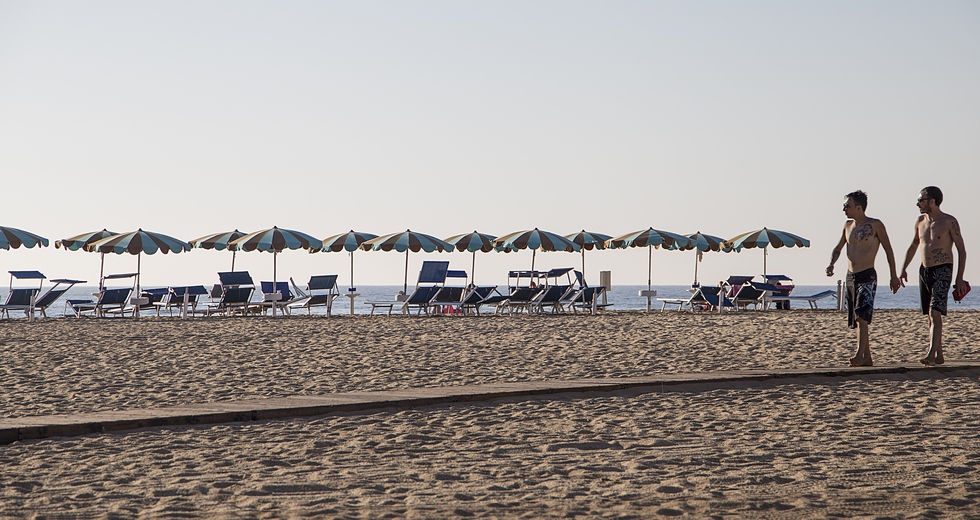 Se non fosse che per lo strano gioco prospettico innescato fra passerella e sfondo, i due protagonisti sembrano giganti fuori scala rispetto agli ombrelloni. Il gioco funziona perché non ci sono in vista altri umani per un confronto.