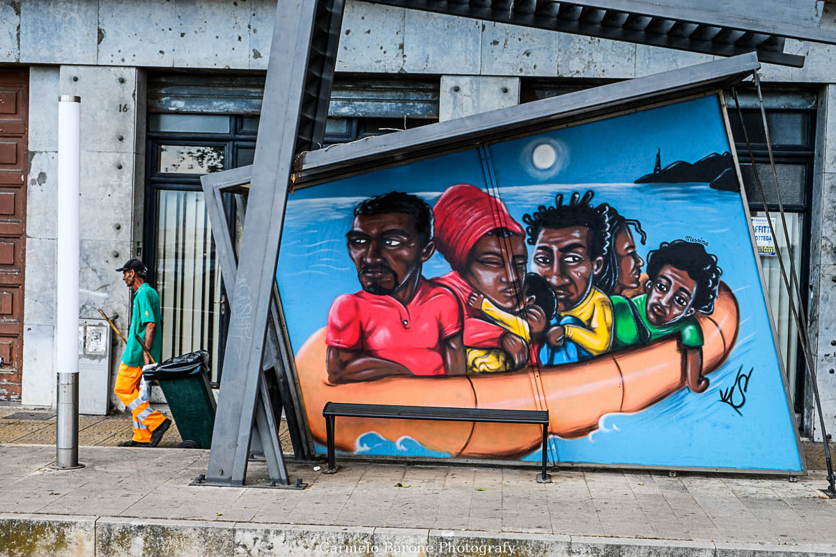 Secondo me, Frank1960, riconosce nell'operatore ecologico un immigrato, anche se questo, in realtà, non è così scontato. Ma sulla base di questa convinzione, costruisce, con il provvidenziale murales, un'idea. La tragedia di migliaia di persone che, spinti dall'illusione di una vita migliore, la cercano qui. Qualcuno magari ce la fa. Il netturbino, forse fra questi, viene guardato e visto come una chimera dal primo personaggio a sinistra nel gommone.