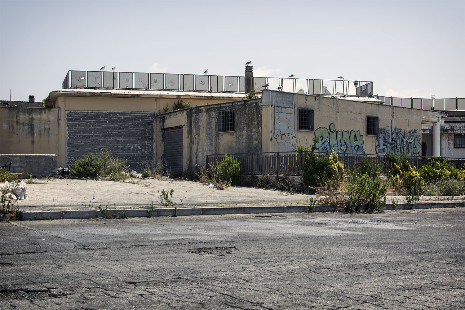 La luce, benché non ottimale, a mio avviso contribuisce a rafforzare la connotazione di rovina silenziosa impressa allo scatto. Una strada piena di buche e di aperture. Un edificio abbandonato. Gabbiani, gli unici attenti sorveglianti.  |