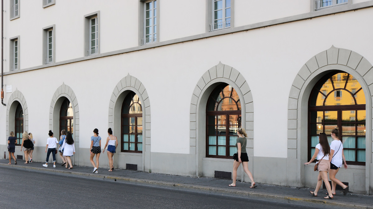 L'incedere delle ragazze è piacevole alla vista per la parte che le comprende fino al limite superiore delle arcate, poi bruscamente viene infastidito dalla chiusura di cui si e' parlato poco prima, il tubo inserito a sinistra e, e' vero, ben dritto, di fatto pone un limite, un freno all'andare delle ragazze.