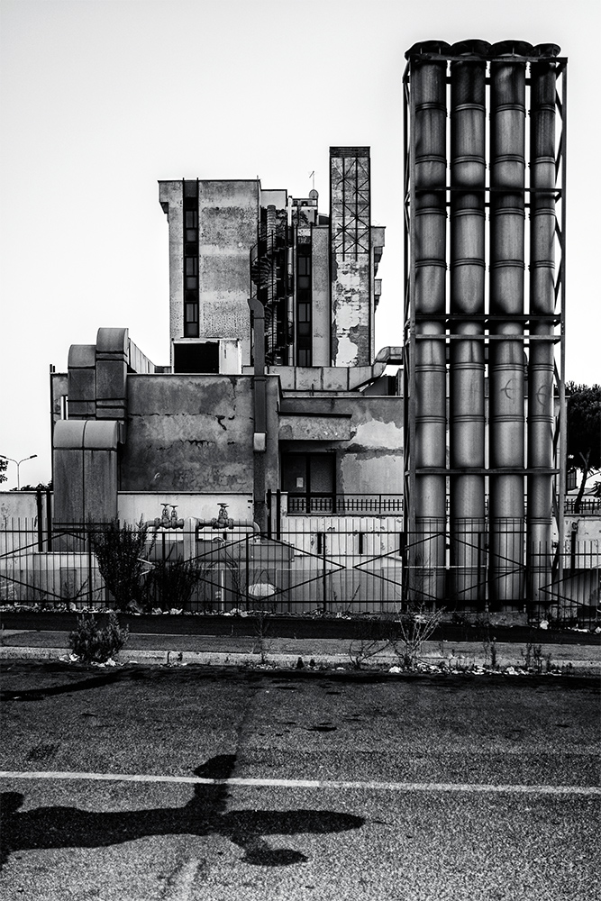 Un bel bianco nero . Caratteristica l'ombra in basso che mi riporta a dell'olio caduto, guarda caso in prossimità di una grande fabbrica. Curiosa coincidenza. Perfetto il taglio verticale, il tuo buon senso di non clonare nulla , come quel palo a sx e la vegetazione. Lo apprezzo perchè è forma di convinzione in ciò che si crede. Inutile dirti che io l'avrei annientato, sono pessimo in queste cose.